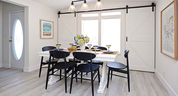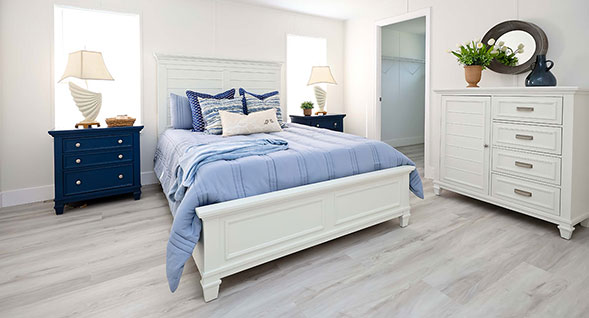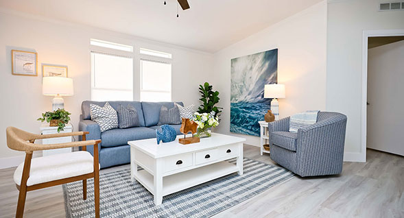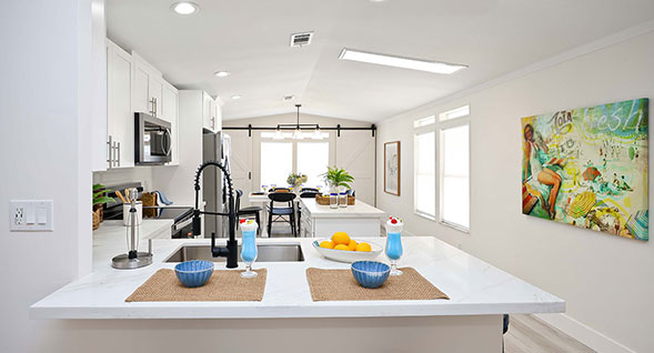 Welcome to Key Largo Cottage — a beautifully reimagined 3-bedroom, 2-bath 2006 Skyline Key Largo home situated along the desirable perimeter road of Rexmere Village. From the moment you arrive, the home’s inviting curb appeal shines with its newly painted tan driveway accented in black, fresh black shutters, tidy landscaping, and charming covered entry. Inside, this stunning home reveals a bright open floor plan with smooth ceilings, brand-new waterproof vinyl plank flooring, and elegant 5-inch baseboards throughout. The spacious living and dining areas flow seamlessly into a fully remodeled kitchen featuring crisp white cabinetry, quartz countertops, stylish subway-tile backsplash, stainless-steel and black appliances, and a large center island perfect for both prep and casual dining. A rustic barn-door window feature adds both style and flexible light control to the dining area, while the living room’s coastal-inspired décor evokes a relaxed Key Largo vibe. The serene primary suite offers a retreat-like atmosphere with generous closet space and an upgraded bath showcasing dual sinks, new fixtures, and contemporary finishes. Outdoors, enjoy a huge backyard — ideal for pets, gardening, or entertaining — plus a covered carport and storage shed. Finally, like all homes in this desirable lakeside community, you will appreciate central air and heat, your own outdoor storage shed, and access to the community’s extensive recreational amenities including fitness, tennis, basketball, shuffleboard, putting green, clubhouse, sauna, relaxation room, heated oversized pool complex, lake recreation and more.